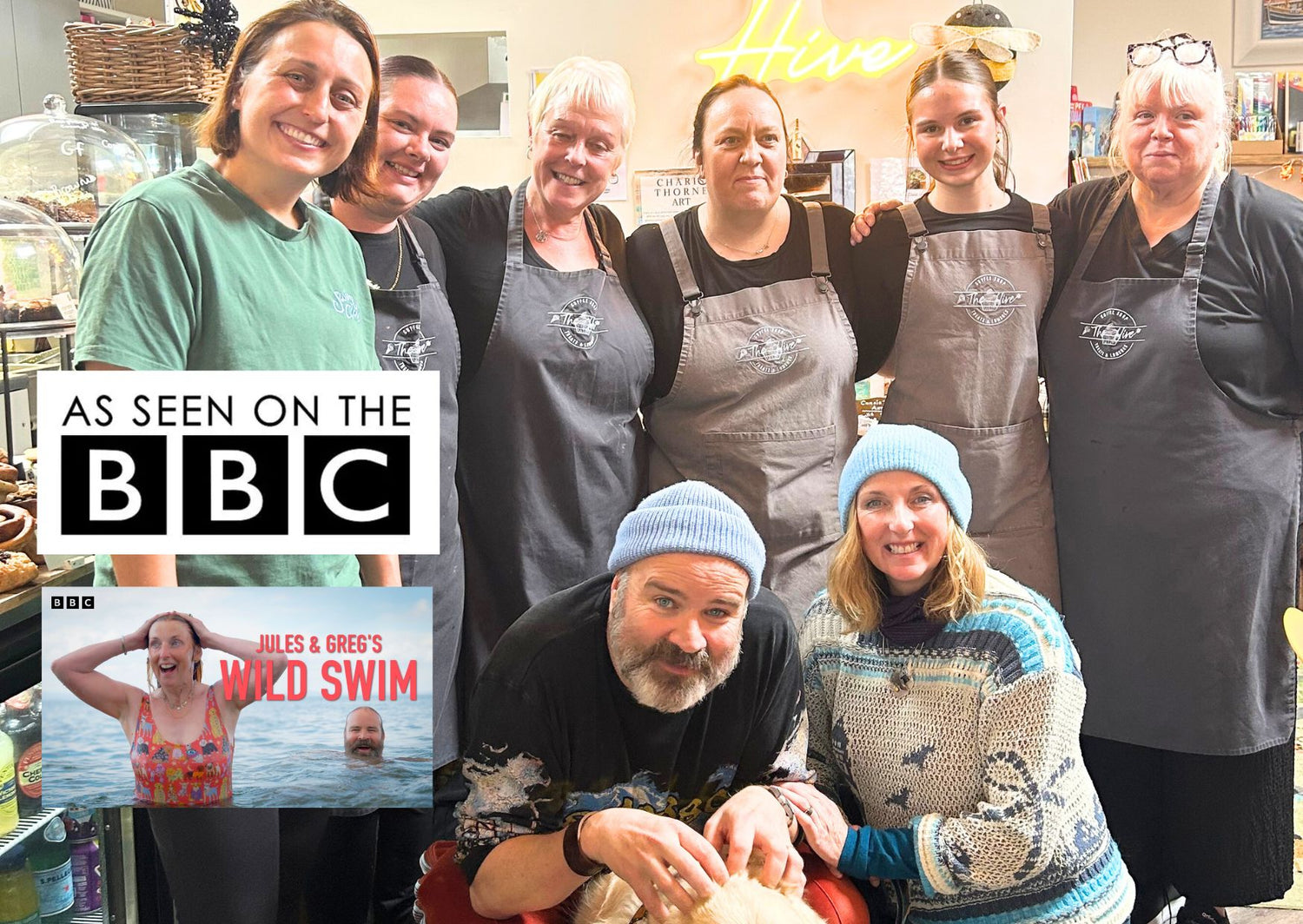 The Hive featured on BBC Jules & Greg’s Wild Swim when Julie Nimmo and Greg Hemphill visited Garlieston Bay and stopped in for coffee and cake with Bonnie the dog. Amye also shared her love of cold water swimming during the programme.